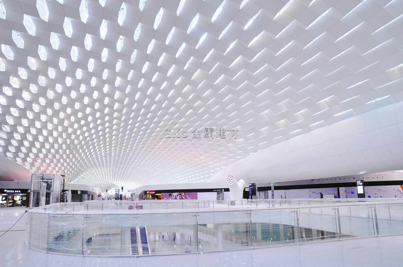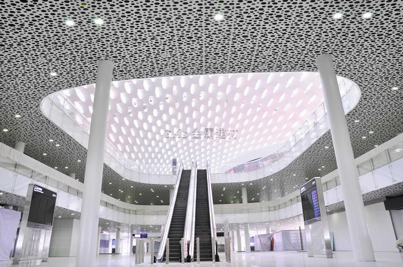 航站楼室内大空间吊顶采用了乐鱼平台专利技术的三维可调爪件系统,调节蜂窝复合铝板三维空间调
