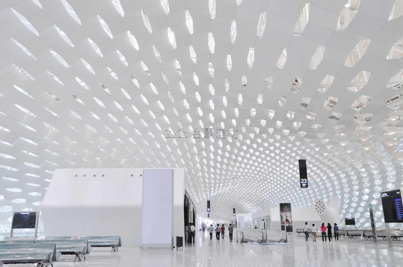 节和定位。室内数十万件特制的蜂窝铝板连续砌合,拼接成无数六边形网格大吊顶,吊顶的网格与屋面的天窗相互错位,在传递自然光的同时却遮蔽了直射的阳光。整个大吊顶不同区域的曲面变化和光影效果结合非常完美,同时每个细节的处理都充分体现出环保节能的设计理念。