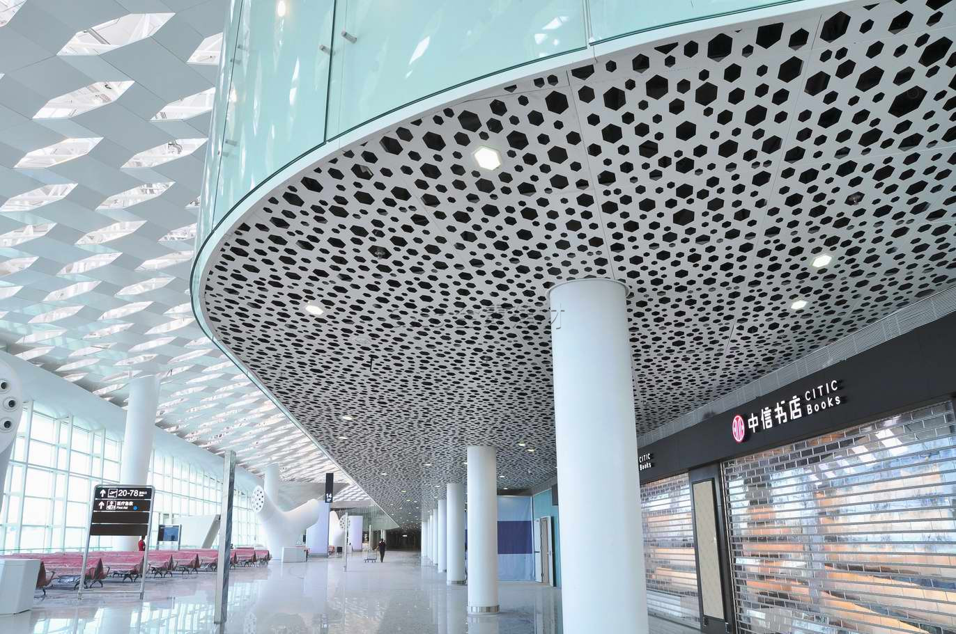 航站楼楼层间吊顶采用了简单的平面设计,吊顶结构是传统的井字形吊挂系统,面层是采用密缝安装、穿孔率高达50%的穿孔钢板,跳动活泼,大大减轻了低矮的楼层间吊顶给乘客带来的压抑感。