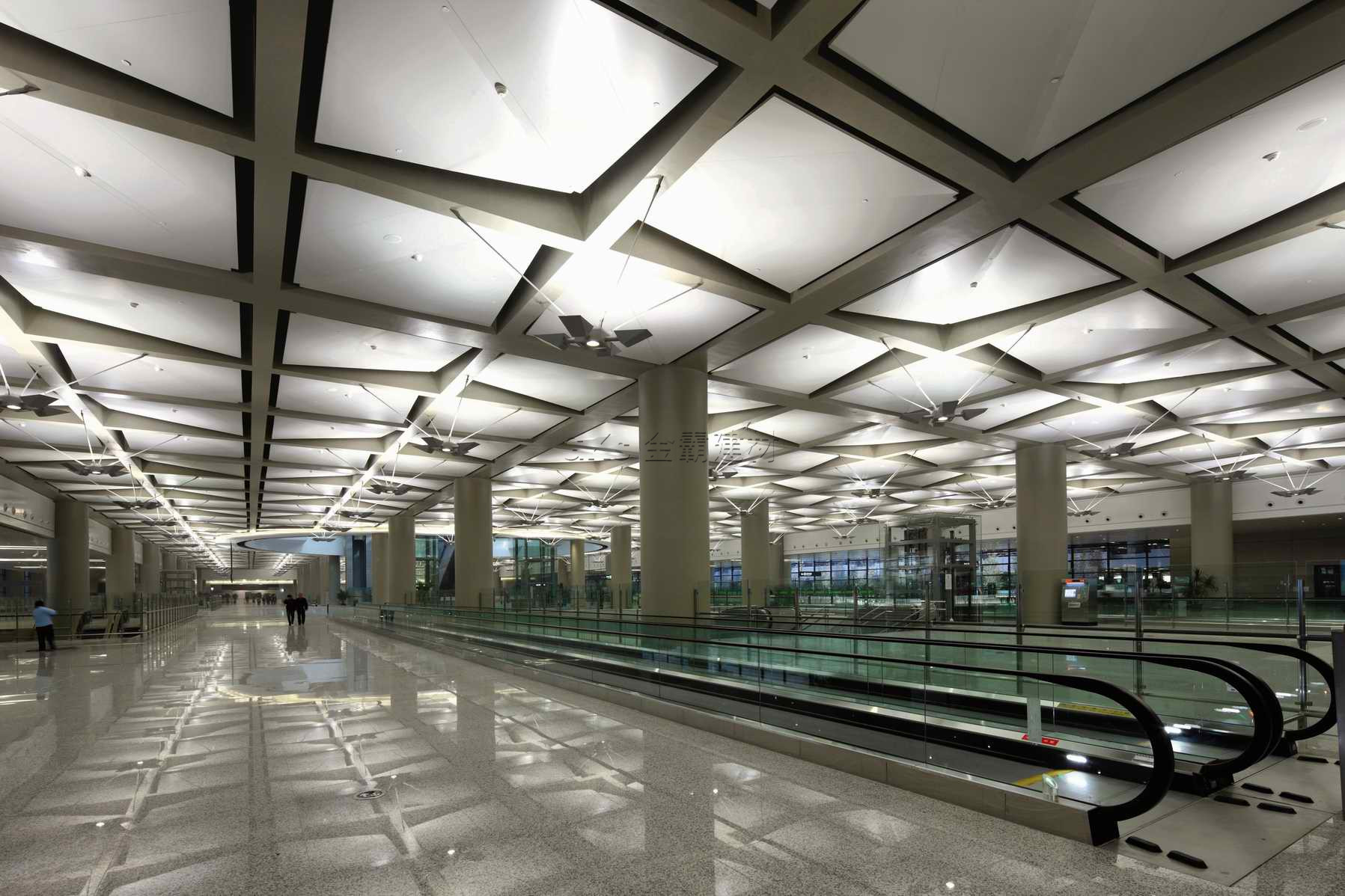 航站楼出发大厅、到港大厅等,采用灰白色长方铝板,平整舒适,美观大方。走廊区域特别的方格天花和前卫的照明吊灯设计,给人眼前一亮。悠闲购物区域金字塔锥形天窗及不规则三角天花的设计,显得富丽堂皇,彰显上海一线沿海城市的气派。