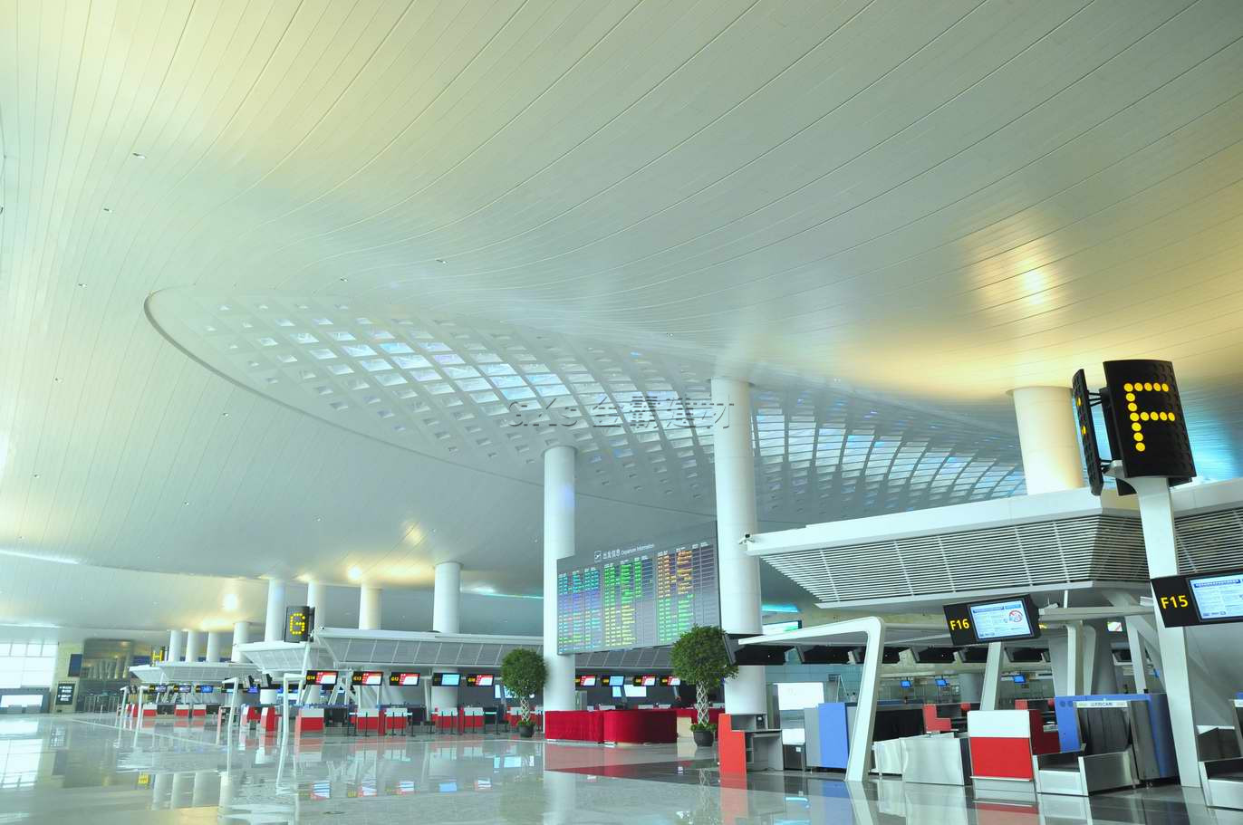 航站楼出发大厅整个室内吊顶全部采用波浪形设计,在每个波浪的顶峰,是整个吊顶系统中最精彩的部分--蚕茧造型组合式吊顶。吊顶采用通透采光的渐变式组合窗口设计,白天阳光透过窗口洒落地面,如粼粼波光的江南水乡。