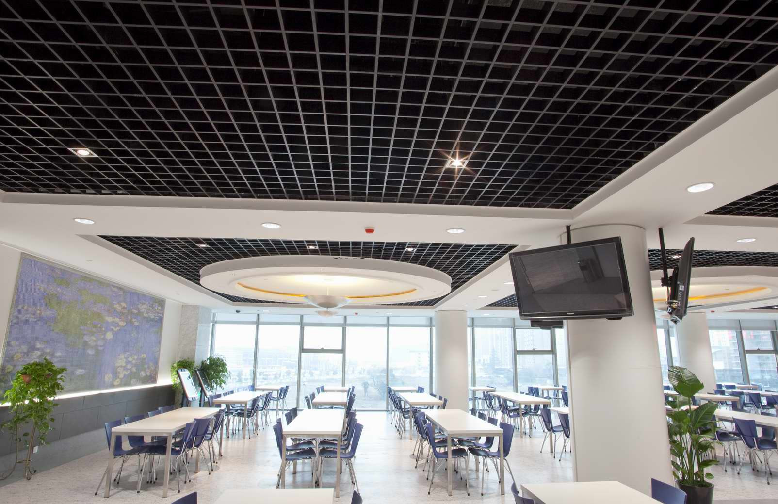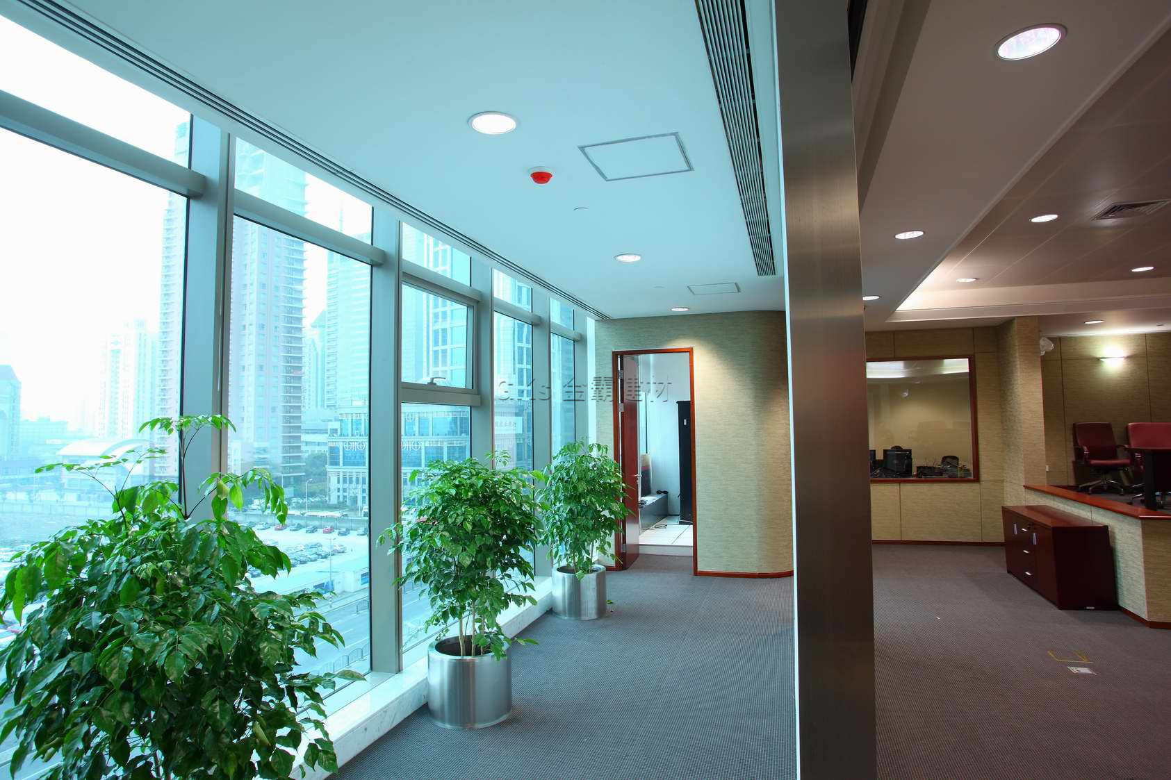 扩建后的中国民生银行大厦,内部装修舒适典雅,富于现代感。公共办公区域多采用光洁耐用的白色铝方板,便于维护的同时,更能提升空间采光度,利于节能。众多办公区域中,也不乏独特设计之处,相同纹理和规格的黑色冲孔铝板及黑色方板互为相邻分布,极有层次感,再增加多块白色曲面条纹造型大铝板作吊顶装饰部分,给吊顶带来丰富的层次感和设计感,独具匠心。