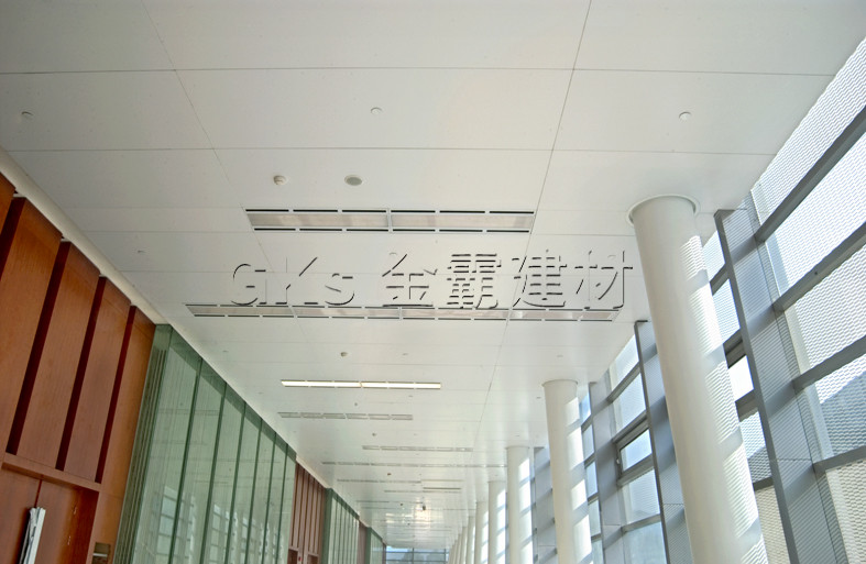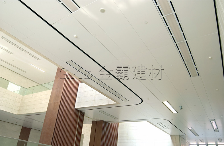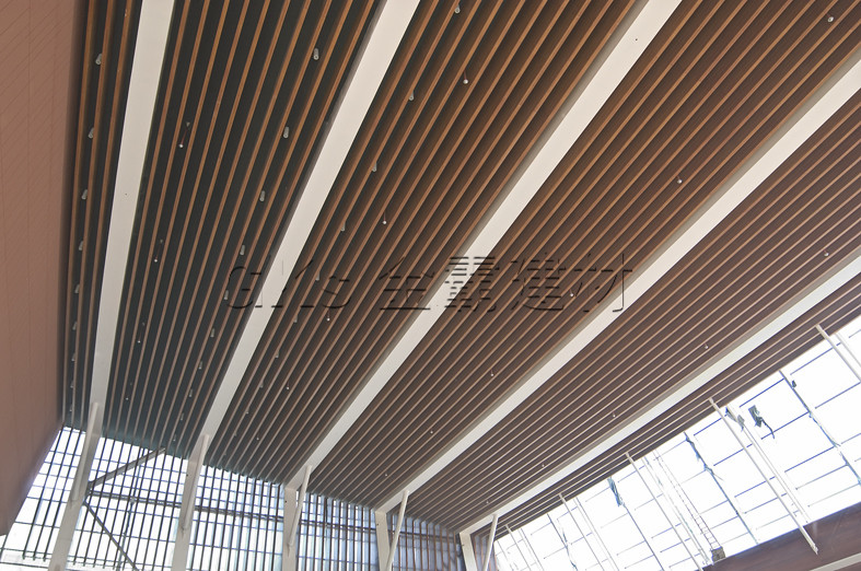 会议大楼大堂及主要走廊吊顶,设计简洁明朗,遵循建筑主体崇尚自然格调的设计方向,部分墙壁、柱面及吊顶采用原木色彩板块,大堂的吊顶就是木纹喷涂工艺的铝合金垂片,均匀而自然的色彩足以媲美真正的原木,却比原木更持久耐用,方便维护。走廊、过道等地方的吊顶更多的是采用具有提升空间明亮感的白色铝合金天花。沿着吊顶边缘及灯槽边缘的镂空黑色线条,与白色天花形成强烈对比,为平淡的吊顶带来了时尚的设计元素。供货时间:2007