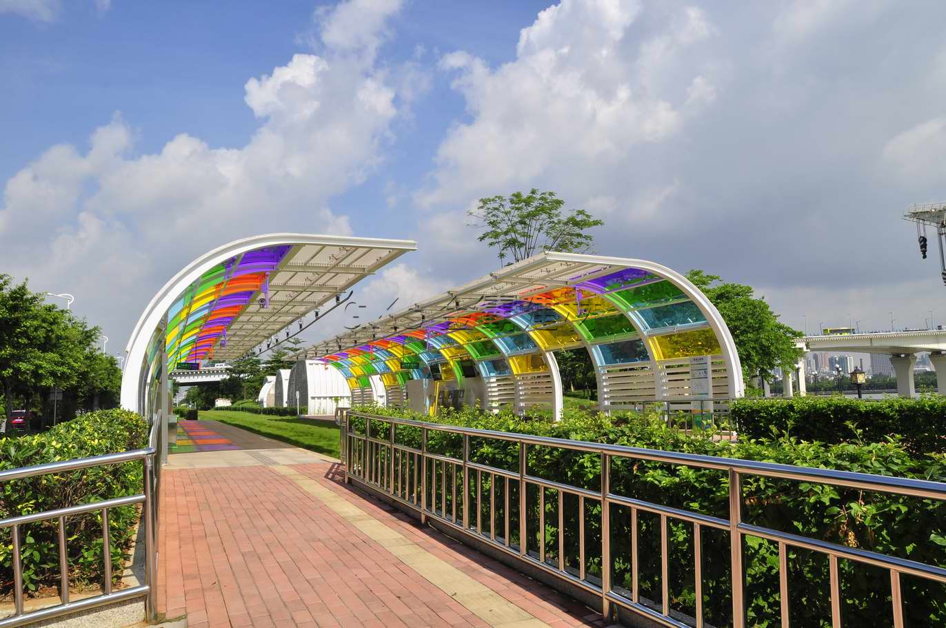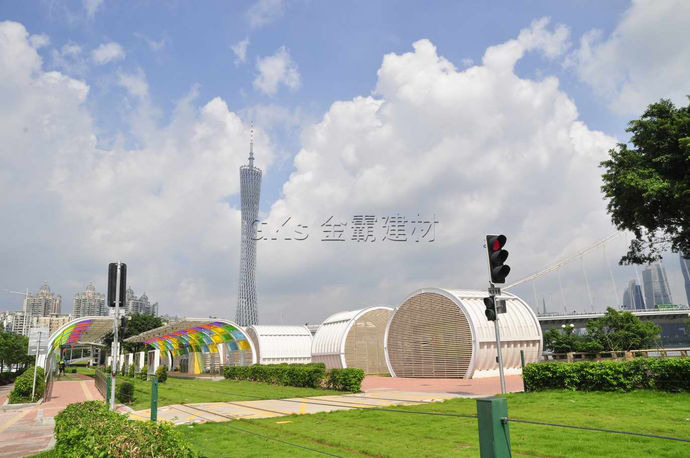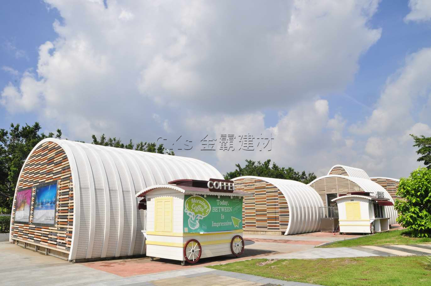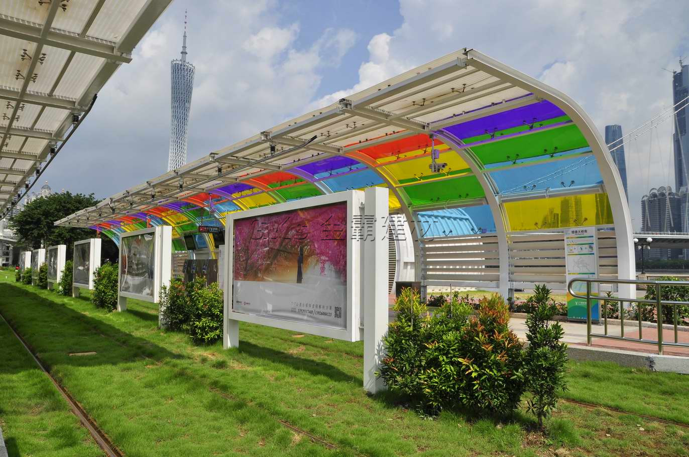 海珠有轨电车10车站都具有鲜明的个性,与沿江景色长廊美丽的环境和谐一致。每个车站屋面及设备墙饰面均采用金霸乐鱼(中国)®氟碳铝单板;各个车站设有充电模块(储电站)为电车停站充电,每个充电模块用铝合金弧形方通和冲孔板精心包裹,椭圆形外观看上去酷似 白色“蛋卷”。万胜围总站的大型储电站,不规则四边形外墙采用黑白色彩氟碳铝板,极具现代设计特色。车站的彩色玻璃棚顶与大型铝合金百叶窗,也兼备了透视美观以及通风遮阳的实用功能。供货时间:2015