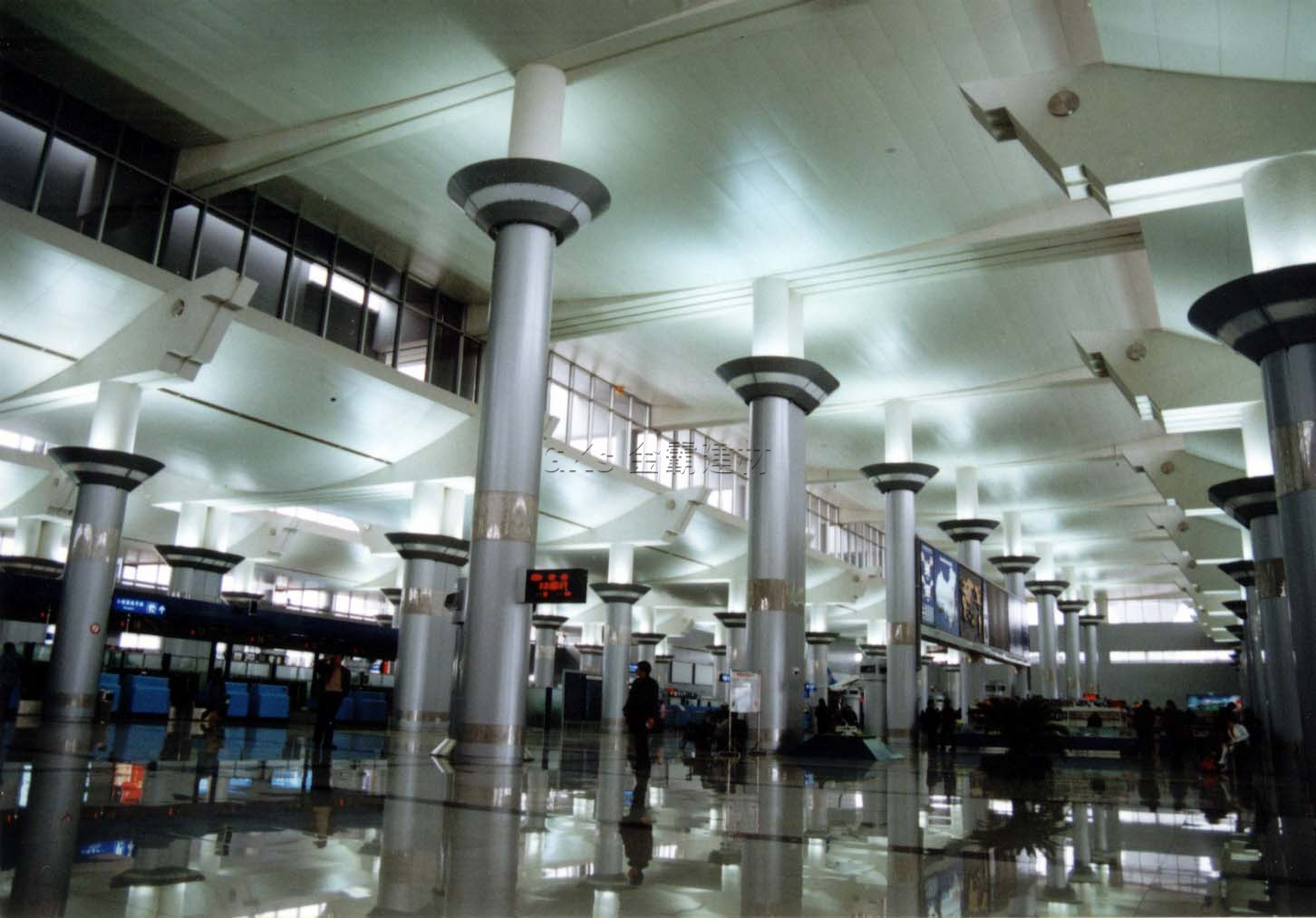 T1航站楼出发大厅大吊顶,采用乳白色铝方板天花吊顶及装饰吊顶,营造船的造型。顶起几艘“大船”的支撑柱采用银色金属柱面,并有金色腰带环绕,。柱顶设有冠状灯盘,灰白相间,柔和透出灯光,在有限的空间内,依然显得气派、大方。指廊行李大厅则采用相反的拱形天花,简洁、舒适,更有开阔空间之感。