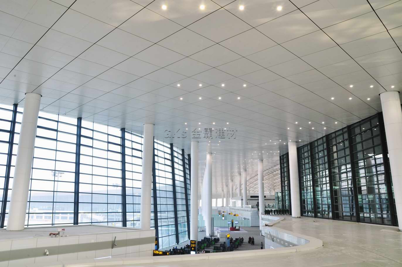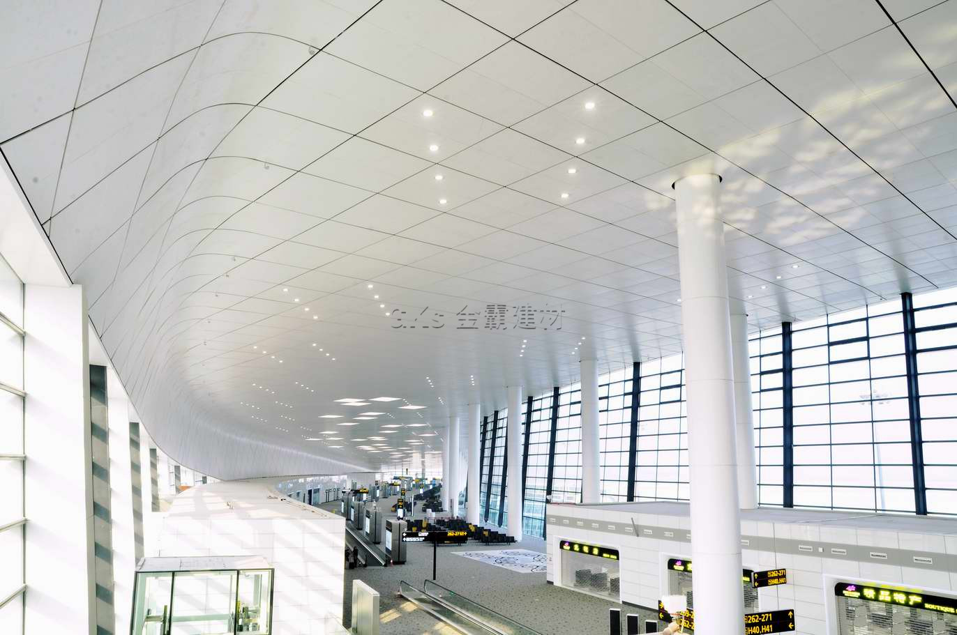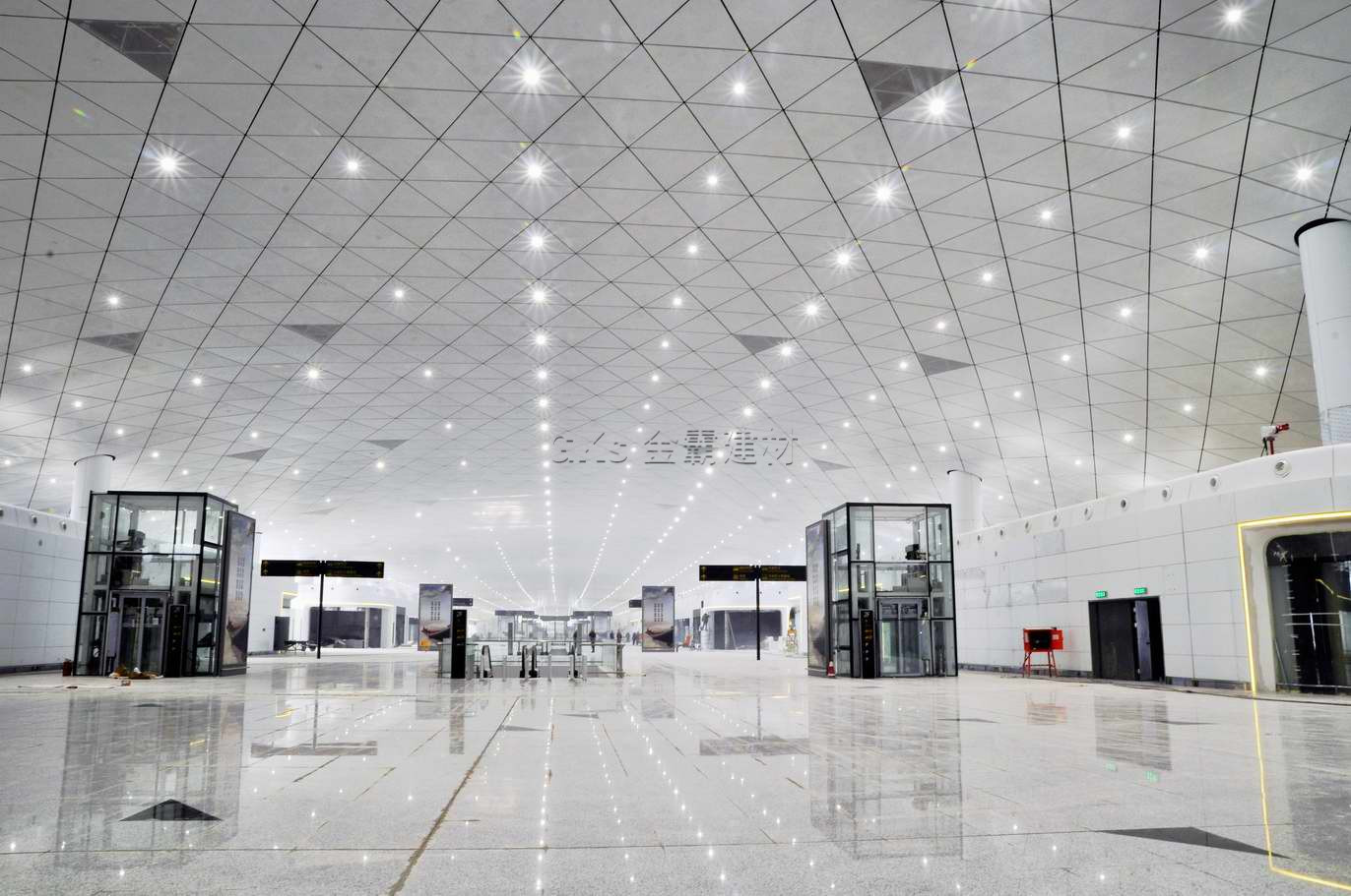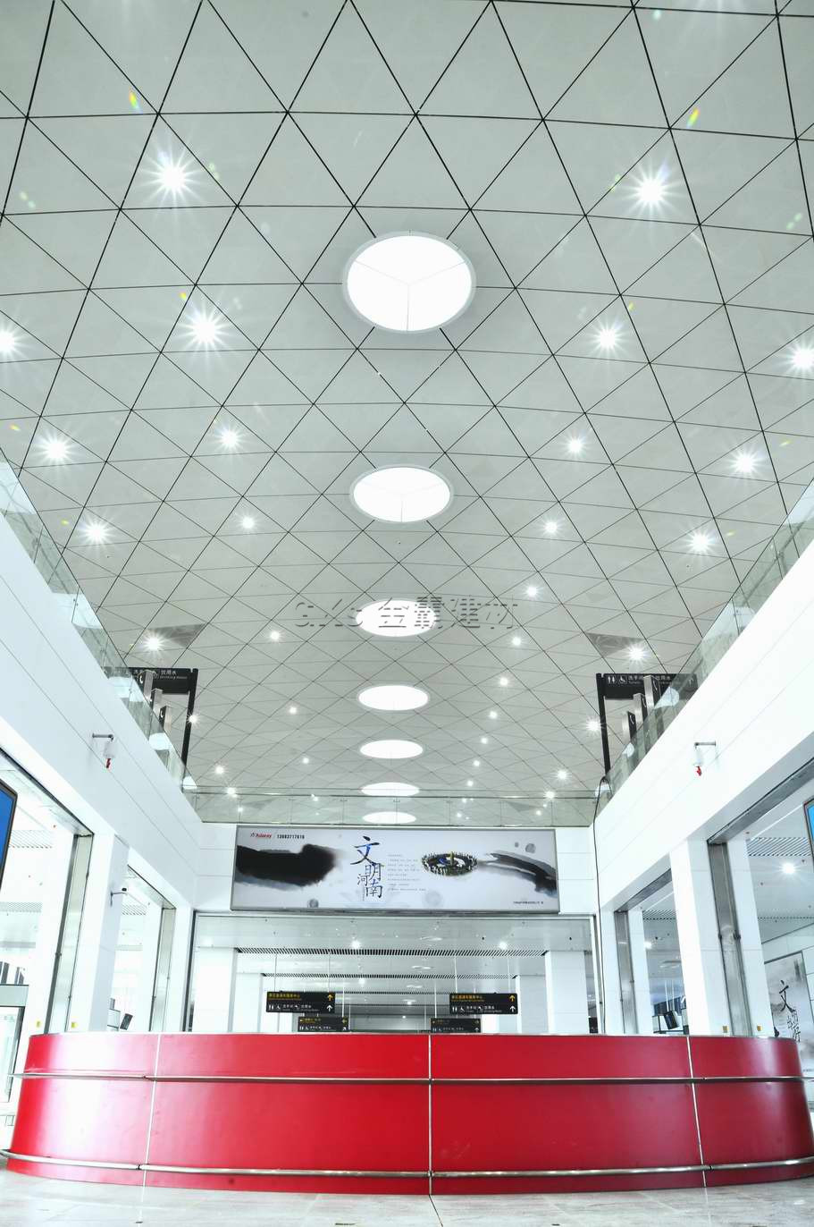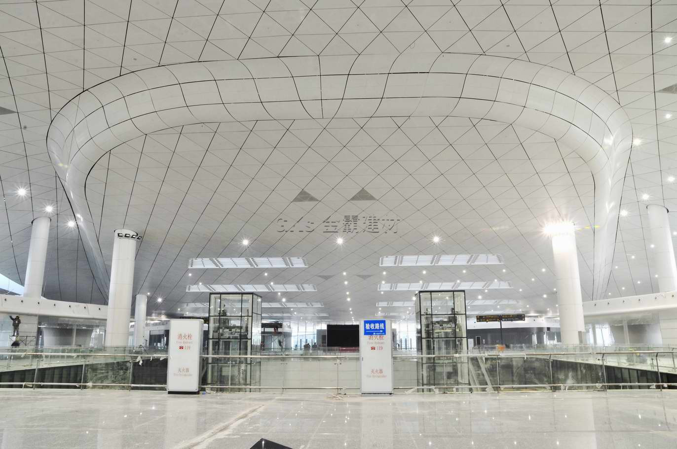 GTC交通换乘中心则是迥然不同的风格,吊顶由六个三角型铝单板组成一个六边形单元紧密排列,沿屋顶中心轴线向大楼两侧曲面延伸,中间以多个三角透光膜冲孔天窗及呈线条排列的闪烁灯光作点缀,营造一种刚柔并济,活泼自然的感觉。中庭吊顶天窗部分与大吊顶呈现两个高低跨度平面的强烈变化,上下两个曲面中间用扭曲型双曲面平滑连接,形成大空间三维立体双曲面吊顶,视觉冲击感强烈。吊顶的各种曲面造型,赋予了航站楼吊顶充满动感力量的生命力。