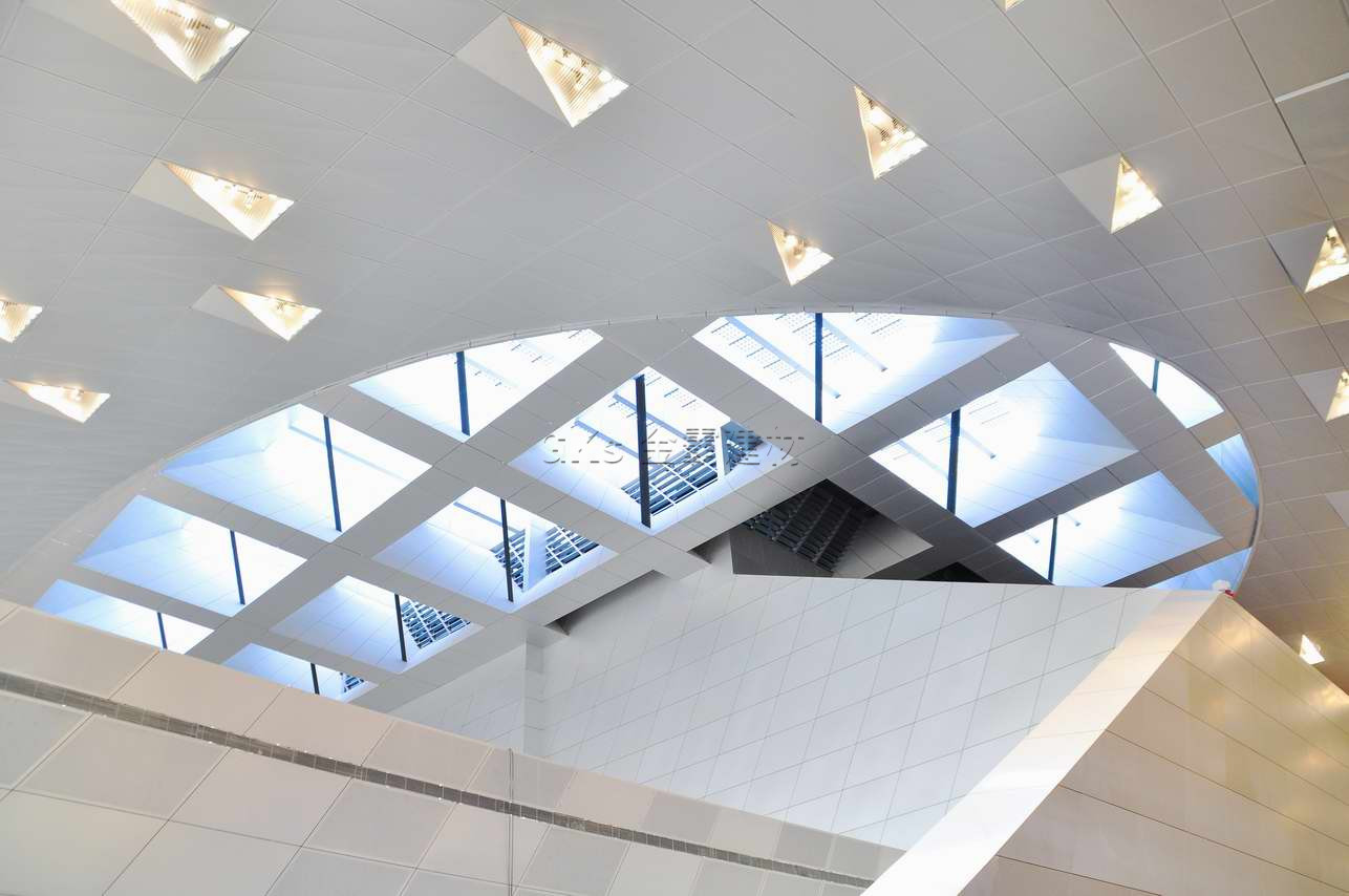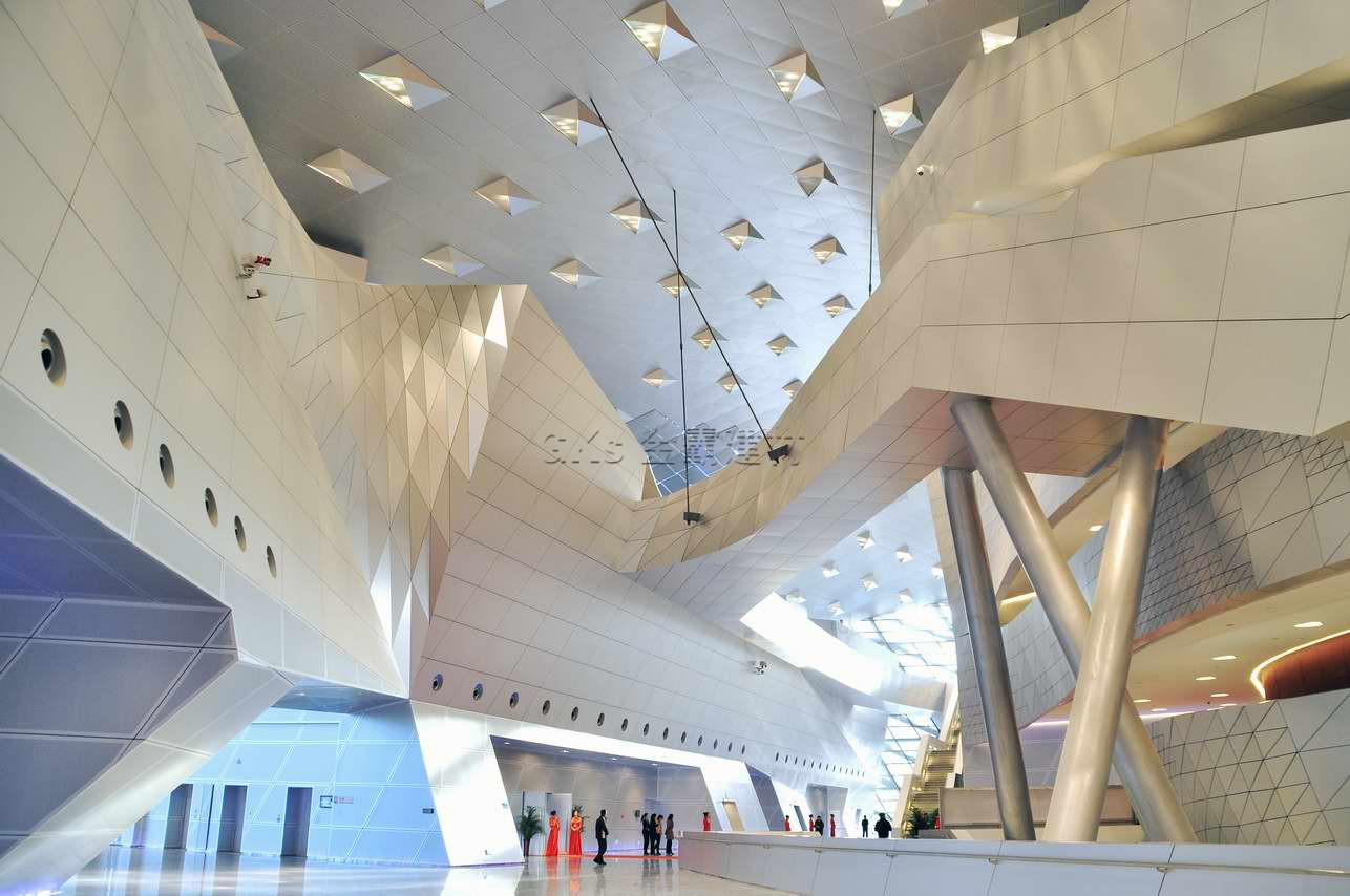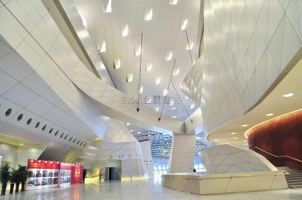 内部空间构造层次丰富,其复杂程度完全不逊于外部结构:曲折变化的墙面,造型各异的柱体,连廊、楼梯、平台等特殊的结构,艺术而又立体地展现出山与海之间互相依靠而又各自独立的关系。而所有这些饰面,同样全部采用阳极氧化铝板,铝板的形状和尺寸随着饰面的转折而变化。在室内精心设计的灯光照射下,每一块铝板在不同的平面与曲面上,向不同的方向折射出深浅不一的光亮,极具层次美感,整个室内大厅光与影闪烁变幻,让人仿佛置身未来的科幻世界。