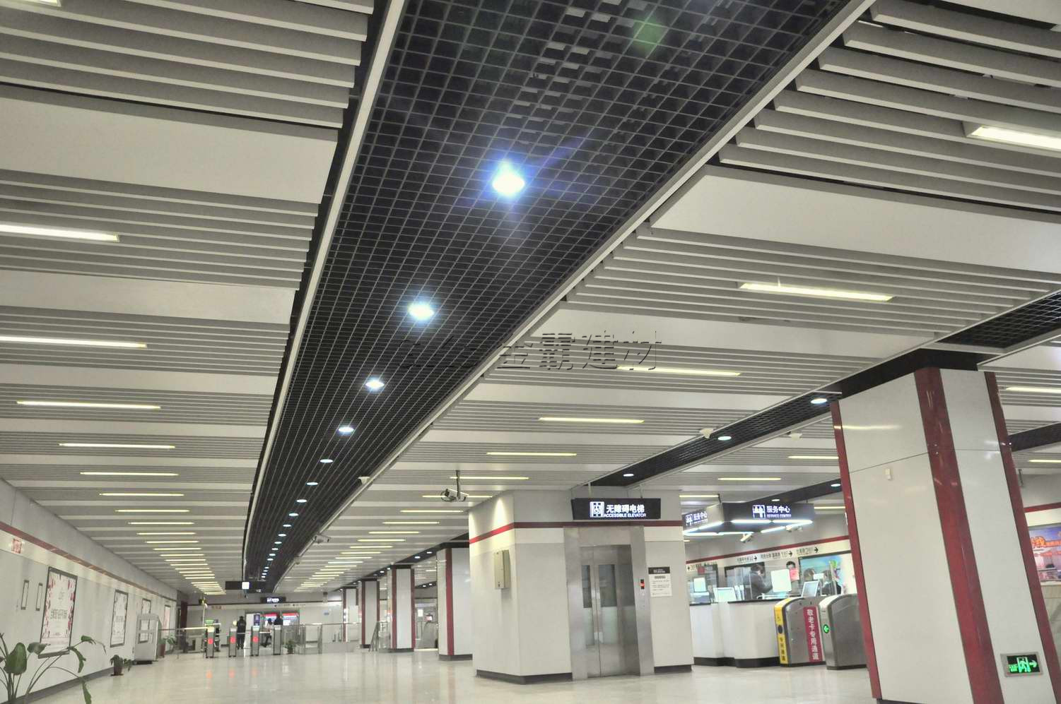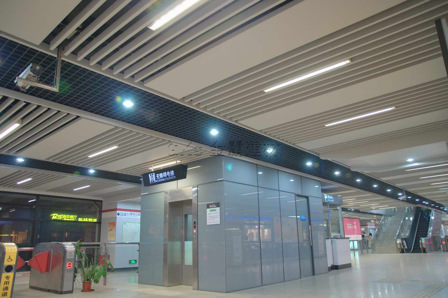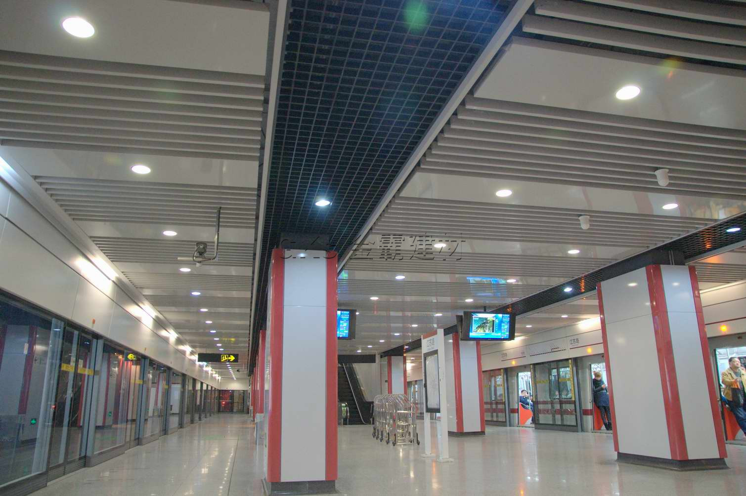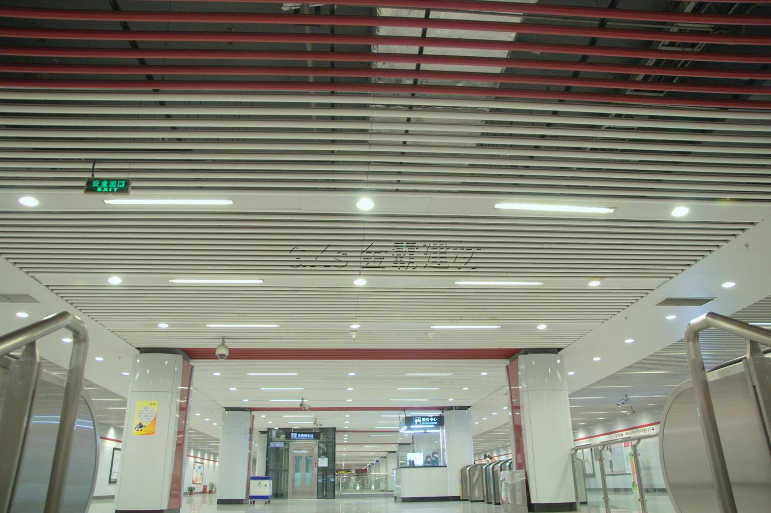 上海地铁11号线的整体站内装饰比较相近,吊顶基本以采用垂片、格栅、铝方板等装饰材料,红白色调喷漆柱饰面,整体风格优雅、严谨、大方,符合上海现代化快节奏大都市的形象。像安亭站和李子园站,采用了基本一致的天花方案,米白色垂片与铝方板相邻间隔排列,节奏分明,柱顶位置顺着柱子排列的方向是一排与方板垂直的黑色格栅,黑白相间,垂直交错,给人严谨而有序的观感。真如站的站厅吊顶较有心思,以圆垂片组成的大吊顶,通过空缺部位组成一条弯曲起伏图案,犹如蜿蜒流淌的河流,生动别致;站台处则是简洁的米白色铝方板,板块横向无缝拼接,纵向留有较宽的板缝作照明位置,整体简洁大方,舒适明快。