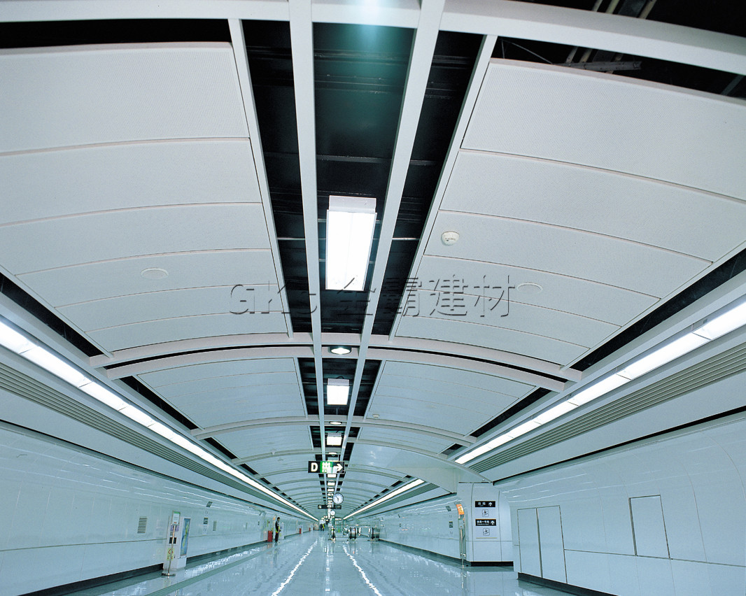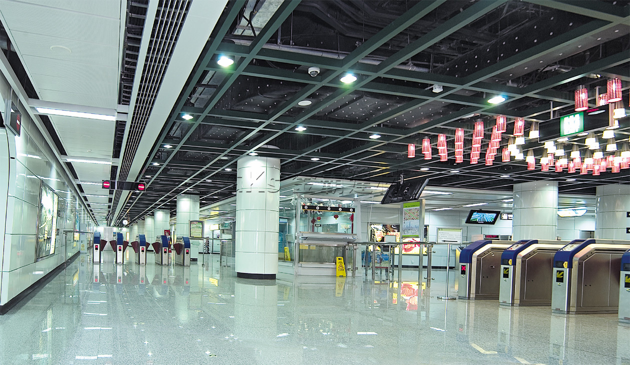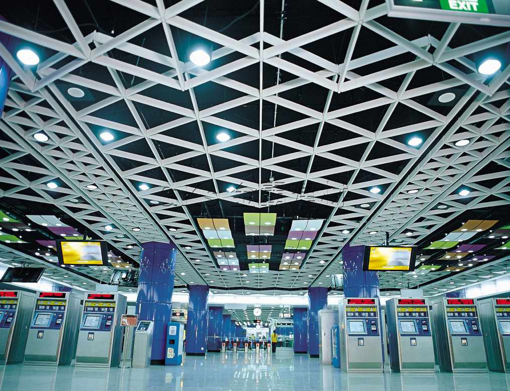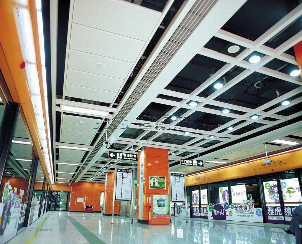 广州地铁三号线吊顶在二号线的标准化、模块化的基础上进一步改进,按顶部设备集中的程度划分不同区域。站厅与站台的两侧,采用乐鱼(中国)®专利技术的开启式冲孔铝板窄缝排列设计,中央部位设计为大跨度的铝型材方通框架,增加了站厅站台的空间感。在标准化的基础上,各站设计仍具有鲜明的个性,如客村站的井字型天花配上黄绿色波浪造型灯架、珠江新城站的菱形龙骨天花、广州塔站的墨绿色井型龙骨加橙白两色小吊灯、东站的长走廊曲面冲孔铝板天花等。