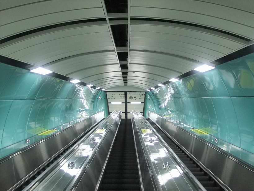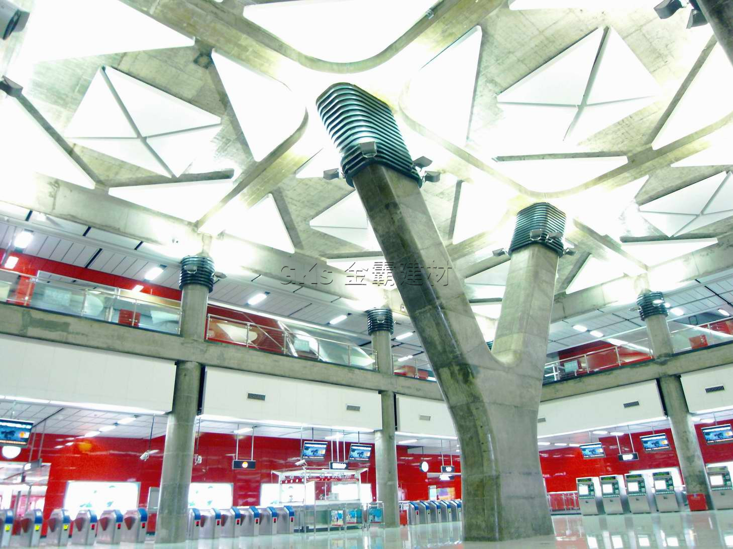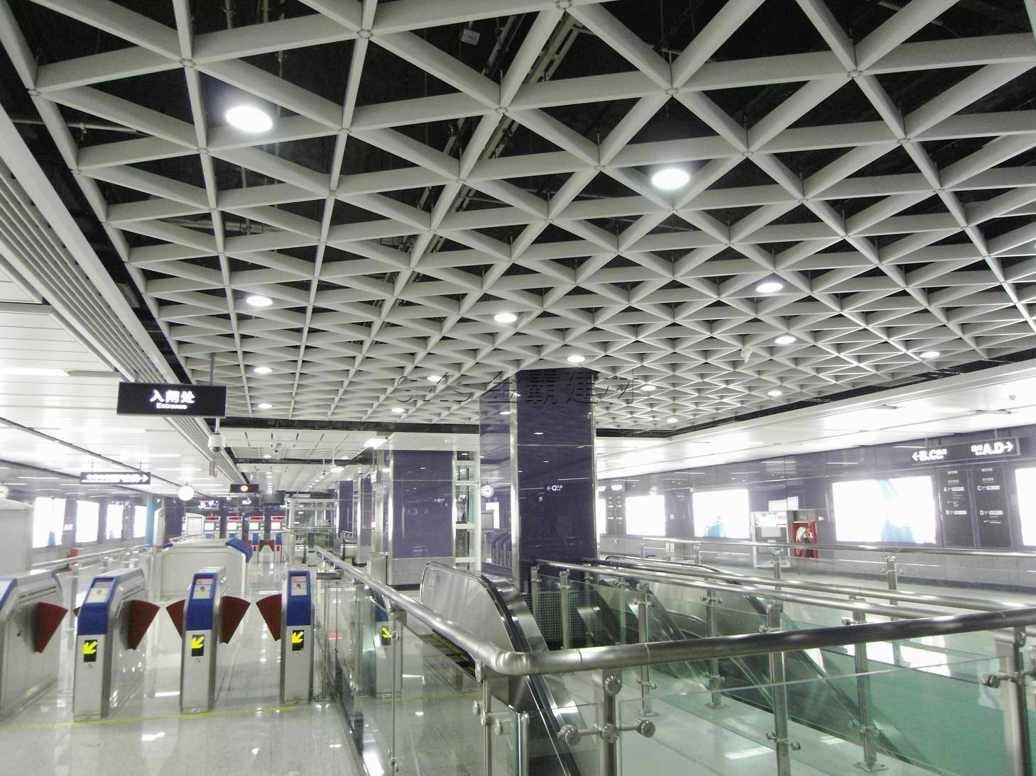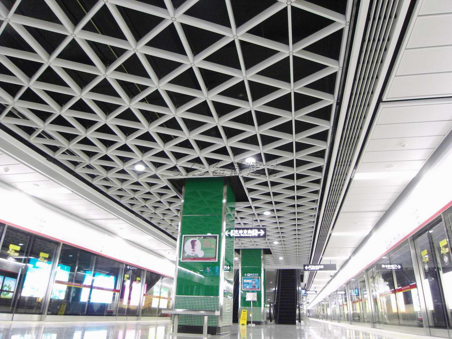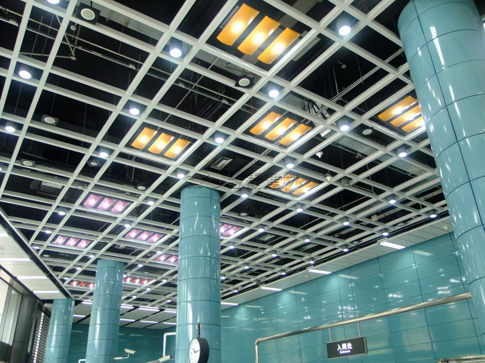 五号线吊顶沿袭了以往按两侧和中央划分不同按区域的设计模式,并在此基础上做了大胆的改进:两侧开启式冲孔板吊顶不再是连续通长模块,改为若干连续的开启式冲孔板单元,与两侧增加的通长风口带吊顶相连;中央区域采用铝型材方通等边三角形网架吊顶,通透开阔。此外,部分特殊站点采用了各种弧形或特殊造型铝板吊顶。
