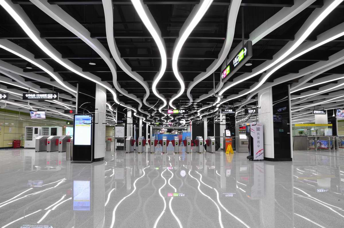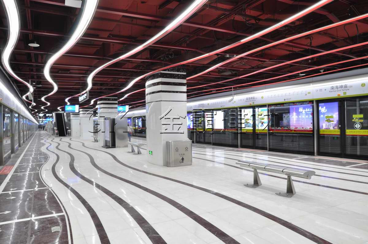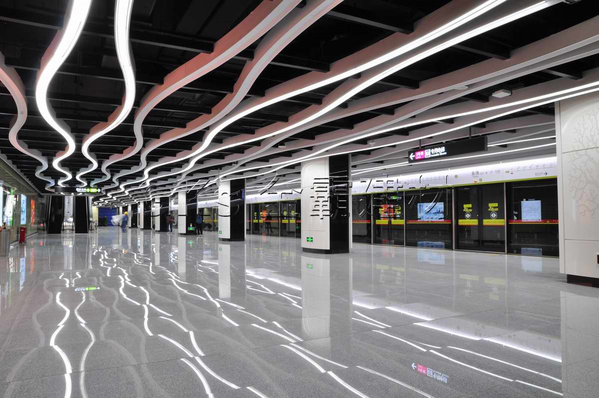 广州地铁13号线首期站内设计主题定为“粤商珠水”,车站天花全部采用镂空式水纹图案装饰,和灯具进行一体式设计,使功能和装饰统一,减少空间压抑感。南海神庙站以“历史之景”为主题,用同样的水纹造型天花灯具一体式吊顶,和大量的传统石材来打造整个文化主题站,展现古代海上丝绸之路发祥地历史风貌及历史悠久的岭南文化。