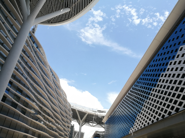 深圳国际会展中心的外墙独特多变,采用了氟碳造型铝单板、造型铝单板、一体板、造型蜂窝铝板等墙面产品,造型上具有一定的加工难度与安装难度。金霸为中心外墙主要供货商之一,外墙供货共16万余平方米。