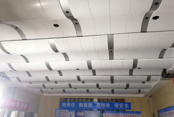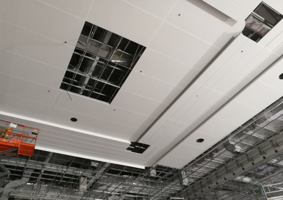 中心的室内吊顶也颇具特色,不同的展厅与功能房间都有不一样的设计,从下图可看出各种造型变化的室内吊顶,都密锣紧鼓地加紧安装当中。吊顶板块造型多变,加工的复杂性也成为了该工程供货的难度之一。