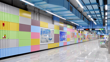 裕丰围站为单柱车站,以“港口印象”为设计主题,采用工业风的基调,墙面以彩色的集装箱元素装饰,橙色为龙门吊,天花蓝白相间,意喻蓝天白云,还原港口繁忙景象的同时,装点了整个地下车站空间。
